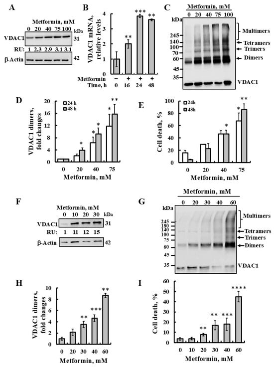 Here, we demonstrated that the incubation of SH-SY5Y cells for 24 or 48 h with metformin resulted, in a concentration-dependent manner, in VDAC1 overexpression at the protein and mRNA levels (Figure 1A,B), oligomerization (Figure 1C,D), and high (80–90%) apoptotic cell death (Figure 1E). This suggests that metformin acts as another apoptosis inducer, enhancing VDAC1 expression which results in its oligomerization, leading to apoptosis. Similar results were obtained using U-87MG cells (Figure 1F–I).