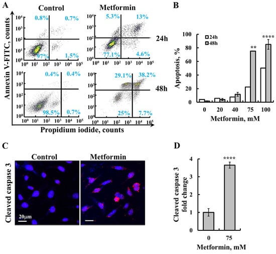 To more directly assess apoptosis, Annexin V–FITC and propidium iodide (PI) staining were performed followed by flow cytometric analysis, along with the evaluation of cleaved caspase-3 levels (Figure 2). The results demonstrated that metformin induced apoptotic cell death in a concentration-dependent manner (Figure 2A,B). Furthermore, immunofluorescence (IF) staining for activated caspase-3 in SH-SY5Y cells treated with metformin revealed an increase in cleaved caspase-3 levels, further confirming apoptosis induction by metformin (Figure 2C,D).