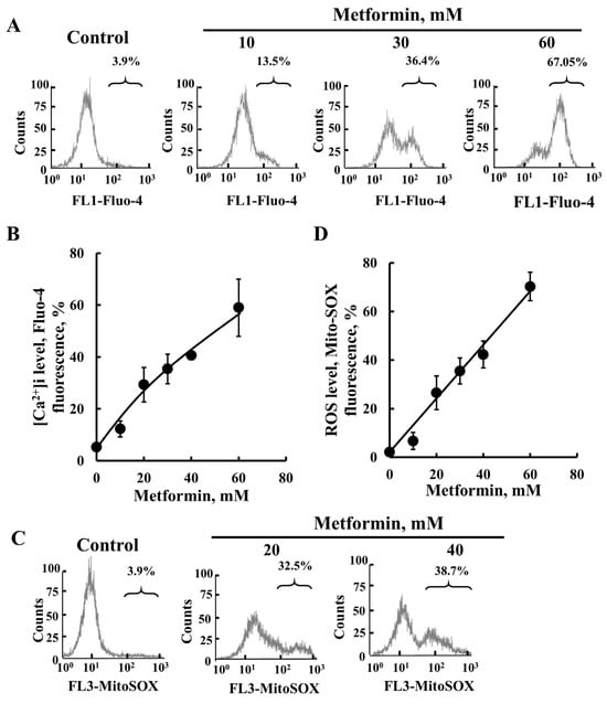 Among the changes taking place upon the activation of the intrinsic apoptotic pathway are the increased levels of cytoplasmic [Ca2+] and ROS production. Metformin induced an increase in both Ca2+ (Figure 3A,B) and ROS production (Figure 3C,D).