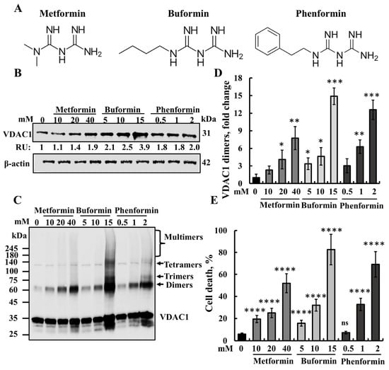 Buformin and phenformin induce VDAC1 overexpression, oligomerization, and apoptotic cell death. (A) Chemical structures of metformin and its analogs buformin (1-butylbiguanide) and phenformin. (B–E) SH-SY5Y cells were incubated for 48 h with the indicated concentrations of metformin, buformin, and phenformin. The cells were analyzed for VDAC1 expression levels (B) by immunoblotting using anti-VDAC1-specific antibodies, with β-actin used as a loading control. VDAC1 levels are shown below the blot in relative units (RUs). Additionally, VDAC1 oligomerization was assessed by incubating protein samples (1 mg/mL) with the cross-linking reagent EGS (100 μM), followed by immunoblotting using anti-VDAC1 antibodies. The positions of the VDAC1 monomers, dimers, trimers, tetramers, and higher oligomers are indicated (C). The level of VDAC1 dimers was quantified using ImageJ software (D) and presented relative to its levels in control cells. Samples were also analyzed for cell death (E) by PI staining and flow cytometry. The results represent the means ± SE; p < 0.05 (*), p < 0.01 (**), p < 0.001 (***), or p < 0.0001 (****), ns—non-significant.