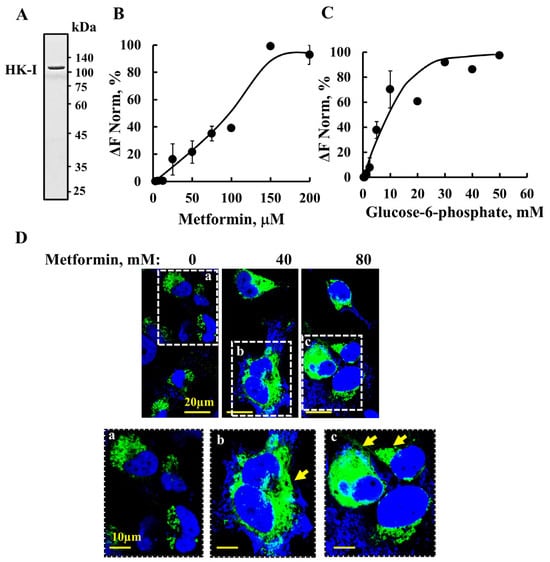 Metformin binds to HK-I and detaches it from the mitochondria. (A) Coomassie blue-stained recombinant HK-I was purified as described previously [75]. (B,C) Fluorescently labeled purified HK-I was incubated for 30 min at 37 °C with increasing concentrations of metformin (5 to 200 μM) (B) or with glucose-6-phosphate (0.6–60 mM) (C), and then micro-scale thermophoresis (MST) was performed. The results are presented as a % of the bound fraction. (D) SH-SY5Y cells were seeded on 13 mm glass coverslips, transfected to express HK-I-GFP (24 h, 1 μg, green staining), and incubated for 4 h with and without the indicated concentration of metformin. They were fixed, stained with DAPI (blue staining), and visualized under confocal microscopy. Enlarged areas in dashed squares are indicated as (a–c), with the arrows pointing to diffused HK-GFP. The results represent the means ± SEM (n = 3).