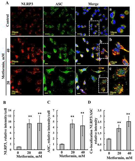 The nucleotide-binding and oligomerization domain (NOD)-like receptors (NLRs) are pattern-recognition receptors, with the family member known as the NLR pyrin domain containing three (NLRP3) forms the inflammasome. The activation of NLRP3 inflammasome is associated with mitochondrial dysfunction, increased ROS production, and the release of mitochondrial DNA (mtDNA) into the cytosol to evoke an inflammatory response [84,85]. As metformin inducing VDAC1 oligomerization was found to mediate the release of mtDNA, we tested its effect on the NLRP3 inflammasome (Figure 7). Metformin highly increased the expression of NLRP3 and that of the apoptosis-associated speck-like protein containing a CARD (ASC), leading to NLRP3 inflammasome assembly and activation [86]. The results show that metformin treatment increased the expression of NLRP3 (Figure 7A,B) and ASC (Figure 7A,C), and it induced their co-localization (Figure 7A,D) and the formation of large intracellular assemblies.