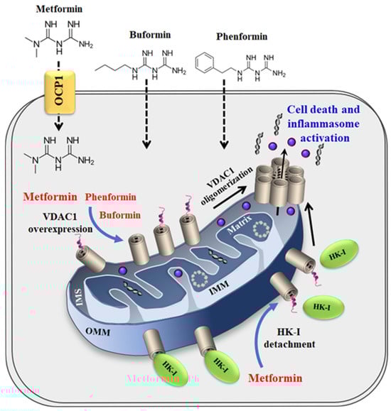 Proposed model for metformin inducing VDAC1 overexpression, oligomerization, and apoptosis. Metformin entering the cell by the transporter OCP1 and hydrophobic buformin and phenformin directly crossing the cell membrane all enhancing VDAC1 expression levels with the overexpression of VDAC1 shifting the equilibrium towards the VDAC1 oligomeric state. This mediates the release of apoptogenic proteins and mitochondrial DNA (mtDNA), leading to apoptosis and inflammation. Metformin detaches HK-I from VDAC1, further enhancing VDAC1 oligomerization, which results in apoptosis and inflammation.