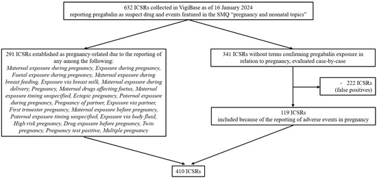De-duplicated ICSRs associated with pregabalin and pregnancy, collected in VigiBase since its inception to 16 January 2024 (date of data extraction), were retrieved. The drug of interest, pregabalin, was identified as an “active ingredient” based on WHODrug [25] and was designated by the reporter as “suspect” of a causal relationship with the reported events. The events of interest related to pregnancy were captured using the SMQ “pregnancy and neonatal topics” (MedDRA version 26.1). MedDRA is a hierarchical dictionary used for coding medical events, organized across five levels from very broad to very specific. The highest level is the System Organ Class (SOC), which groups terms by physiological systems or medical disciplines, while the Preferred Term (PT) level provides a standardized description of a single medical concept. The terms included in the selected SMQ correspond to PTs; therefore, PTs were used in this study to describe adverse events associated with pregabalin exposure during pregnancy and for disproportionality analyses. The initial group of ICSRs was filtered according to the reporting of specific terms confirming pregnancy-related drug exposure (listed in Figure 1). The remaining ICSRs lacking the aforementioned terms were identified based on expert opinion, drawing on the expertise of medical professionals and pharmacists with experience in pharmacovigilance. This process was carried out by two pharmacovigilance specialists (SM and RN) and two clinical pharmacologists (FB and AC), who manually reviewed the ICSRs independently. ICSRs reporting specific adverse events in pregnancy were included in the study population (for the complete list of ICSRs included with this procedure, see Table S2). Figure 1 illustrates the flow chart detailing the selection process of the study population.