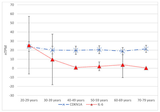 Figure 2. Gene expression data from The Human Protein Atlas© (available at https://www.proteinatlas.org/, accessed on 15 April 2025) are presented in terms of transcripts per million (nTPM) across six age groups: 20–29 years, 30–39 years, 40–49 years, 50–59 years, 60–69 years, and 70–79 years. Focusing on hepatocyte gene expression, two genes traditionally associated with senescence—CDKN1A and IL-6—showed significant differences in expression between the various age groups. The Tukey–Kramer test indicated a significant difference (p = 0.04) when comparing CDKN1A expression between the 20–29 and 60–69 age groups. Significant differences were also seen when comparing the 20–29 age group with the 40–49 age group and each subsequent age group. For comparisons involving three age groups, starting with the 40–49 age group, the p-value for gene expression means was found to be less than 0.01. Additionally, the 70–79 age group demonstrated a significant difference (p = 0.012) compared to the 20–29 age group.