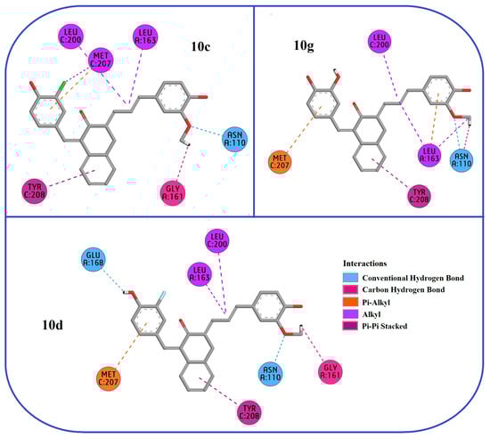 2D Interaction Diagrams of the Top-Scoring Compounds (10c, 10d, and 10g) with SARS-CoV PLpro Enzyme.