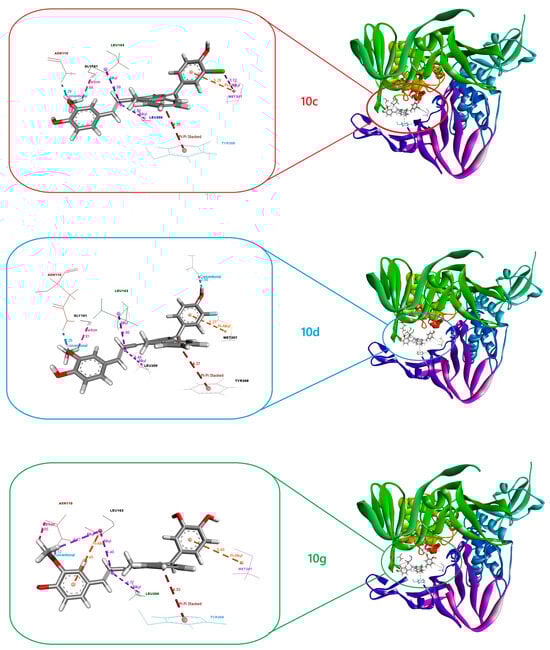 In order to better visually compare the binding affinity trends of curcumin derivatives on PLpro enzymes, the obtained docking scores are presented graphically in Figure 2. When this graph is analyzed, it is seen that the binding trends of curcumin derivatives to the PLpro enzymes of CoVs generally follow a sequence as SARS-CoV (2FE8) > SARS-CoV-2 (6WUU) > MERS-CoV (4RNA). In particular, the three curcumin derivatives that bind most strongly with SARS-CoV PLpro (2FE8) were 10g (−10.8 kcal/mol), 10c (−10.7 kcal/mol), and 10d (−10.7 kcal/mol), respectively. In this context, 2D interaction diagrams were constructed to elaborate the binding mechanisms and molecular interactions of the hit compounds 10c, 10d, and 10g, which have the highest affinity with the SARS-CoV PLpro structure, and are presented in Figure 3. Also, 3D interaction details were depicted in Figure 4.