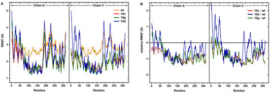 Furthermore, MET207 stands out as another critical amino acid residue that enhances binding stability at the active site by exhibiting Pi-alkyl and alkyl interactions with all three compounds. Moreover, a common Pi-Pi stacked interaction with all three compounds was observed with TYR208. This interaction can contribute to the stabilization of the inhibitors at the enzyme active site by promoting strong binding between aromatic rings, and hence, it can be considered that TYR208 may be another key residue that plays a critical role in inhibitor binding. On the other hand, GLY161 may function as one of the additional stabilization points between the ligand and the enzyme surface by forming caHB with compounds 10c and 10d.