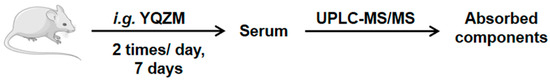 The UHPLC-Q-Exactive Orbitrap/MS system (Thermo Fisher Scientific, Waltham, MA, USA) was employed, utilizing an ACQUITY UPLC BEH C18 column (100 × 2.1 mm, 1.7 µm) with an electrospray ionization (ESI) source. The mobile phase consisted of 2% acetonitrile–water with 0.1% formic acid (A) and acetonitrile with 0.1% formic acid (B). The column temperature was maintained at 40 °C, and the injection volume was set to 3 µL. Dual-polarity data were collected with spray voltages of +3000 V for positive mode and −3000 V for negative mode over a scan range of 70~1050 m/z. ESI source parameters included a sheath gas flow rate of 50 Arb, auxiliary gas flow rate of 13 Arb, capillary temperature of 320 °C, full MS resolution of 70,000, MS/MS resolution of 17,500, and normalized collision energies of 20, 40, and 60 eV. The raw data were analyzed using Progenesis QI v3.0 software, and the mass spectrometry data were compared with Majorbio’s custom-built Traditional Chinese Medicine Exclusive Metabolite Database (MJBIOTCM) to identify the metabolites. Partial Least Squares–Discriminant Analysis (PLS-DA) was used to find the main YQZM absorbed components. Compounds meeting dual criteria of variable importance in projection (VIP) > 1.0 and p < 0.05 were considered statistically significant absorbed constituents.
