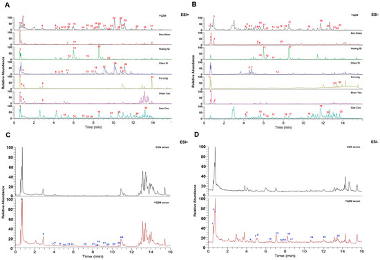Chromatograms of YQZM extract and serum detected by UPLC-MS/MS. The x-axis represents retention time, and the y-axis represents the relative abundance of compounds. (A) Total ion chromatogram (TIC) of YQZM and single botanical drug (ESI+). (B) TIC of YQZM and single botanical drug (ESI−). (C) TIC of control serum and serum containing YQZM (ESI+). (D) TIC of control serum and serum containing YQZM (ESI−).
