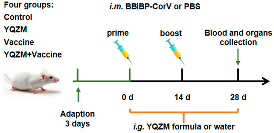 Experimental protocol for the immunization of mice with the BBIBP-CorV and the treatment schedule with YQZM.