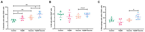Changes in innate immune cells in the immunized mice were investigated using FC. Single spleen cells were isolated, stained, and labeled with surface fluorescent antibodies. The findings revealed that YQZM significantly increased the proportion of natural killer (NK) cells, dendritic cells, and macrophages (Møs), suggesting that YQZM could promote the innate immunity response by increasing the proportion of DC, NK, and Mø cells (Figure 6A–C, Supplementary Material S1).