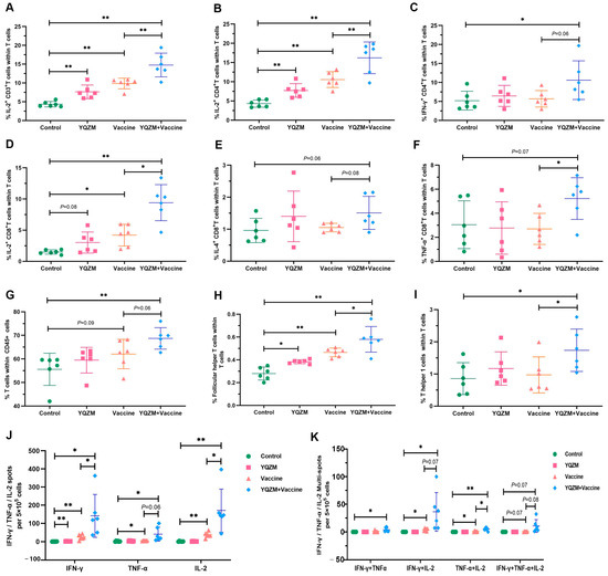 To assess the efficacy of YQZM on antigen-specific Abs, we measured receptor-binding domain (RBD)-specific Abs and NAbs in the serum using ELISA and neutralization assays. As shown in Figure 5A,B, the RBD-specific antibody titers were significantly higher in mice treated with YQZM and the BBIBP-CorV than in those treated with the BBIBP-CorV alone. Additionally, the geometric mean titers (GMTs) of NAbs against SARS-CoV-2 were elevated in the YQZM+ Vaccine group compared to those in the Vaccine group. The NAb titers were 6631 (95% CI = 6348, 6913) in the YQZM+ Vaccine group, versus 5313 (95% CI = 4977, 5653) in the Vaccine group. These results demonstrate that YQZM significantly enhanced spike-specific antibody production in BBIBP-CorV-immunized mice.
