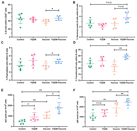 Antibody titers can be maintained by the presence of long-lived plasma cells or reactive memory B cells for many years, even in the absence of re-immunization (boost). Therefore, the detection of plasma and memory B cells following vaccination is crucial for evaluating the durability of immunity earlier and more efficiently. The stimulation of antigen-specific abs production by the BBIBP-CorV resulted in the generation of germinal center (GC) B cells in immune organs. Therefore, FC was used to analyze total B cells, plasma cells, and GC B cells. We observed a greater proportion of B cells, GC B cells, transitional B cells, and plasmablasts in the YQZM+ Vaccine group than in the Vaccine group (Figure 8A–D, Supplementary Material S3). Additionally, the ELISpot results showed that IgG and IgM secretion levels of memory B cells were higher in mice immunized with both the vaccine and YQZM than in mice immunized with the vaccine alone (Figure 8E,F, Supplementary Material S3). These findings show that YQZM enhances vaccine-induced spike-specific Abs by promoting B cell, plasmablast proliferation, and GC reactions, indicating its immunopotentiatory potential for improving antibody responses and long-term protection.