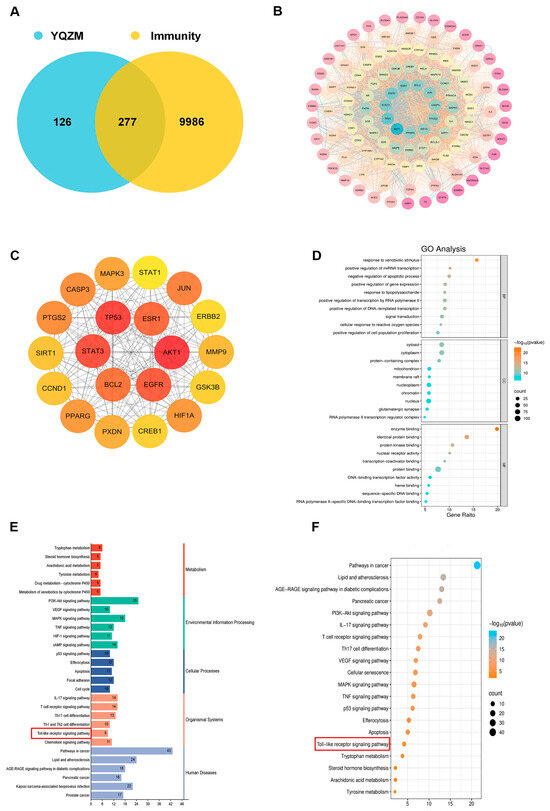 Analysis of potential YQZM action targets and pathways in enhancing immunity. (A) Venn diagram of potential YQZM action targets and immunity targets. (B) Core protein–protein interaction (PPI) network of potential YQZM action targets (114 targets). (C) Top 20 targets of YQZM action targets in enhancing immunity. (D) The top 20 significantly enriched terms of GO analysis are shown in the BP, CC, and MF categories. The X-axis shows the enrichment score, and the size of the circles reflects the number of genes associated with each pathway. (E) The secondary classification of KEGG pathways was selected, with X-axis representing the gene number, the left Y-axis representing the KEGG pathway, and the right Y-axis meaning secondary classification. (F) The top 15 significantly enriched third classification of KEGG pathways were selected, with the X-axis representing the enrichment score.