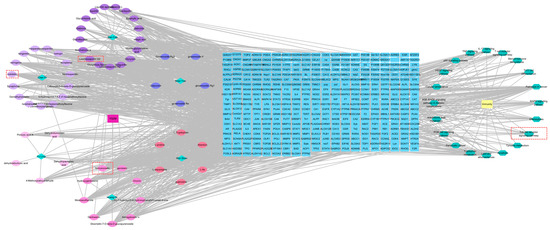 The drug-compound-target-pathway-disease network. The left-side illustrated the chemical compounds of YQZM and single botanical drug, while the right-side highlighted immunity-related functions and the top 10 KEGG pathways. The intersection gene connecting the two was displayed in the middle.