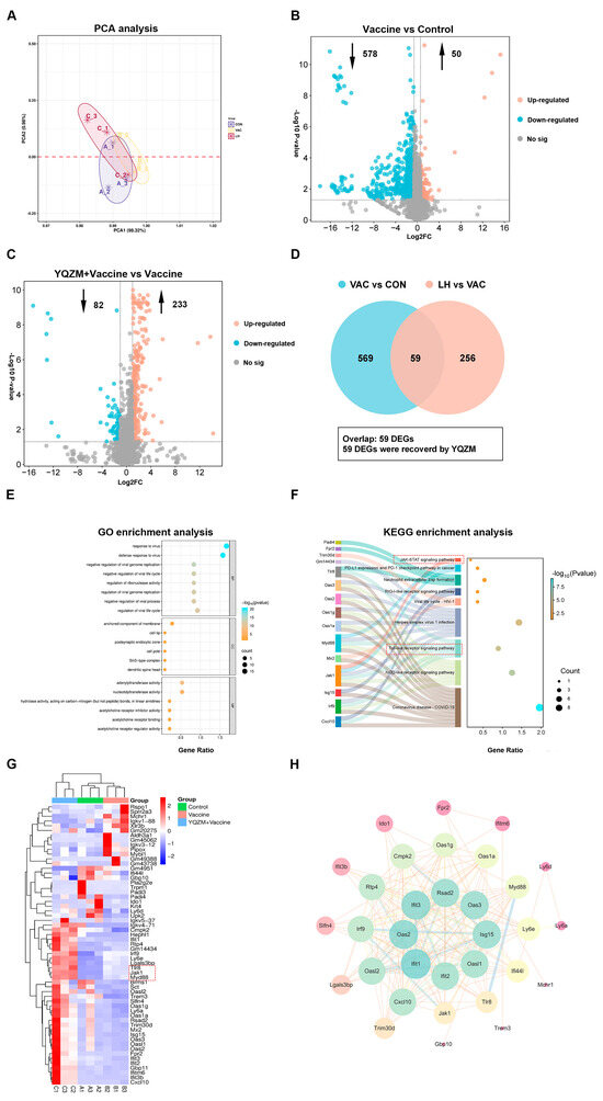 Screening for differentially expressed genes (DEGs) and functional enrichment analysis. (A) PCA analysis of genes in Control, Vaccine, and YQZM+ Vaccine groups. (B) Volcano map of DEGs between Vaccine and Control groups. (C) Volcano map of DEGs between YQZM+ Vaccine and Vaccine groups. (D) Venn diagram of DEGs between Control, Vaccine, and YQZM+ Vaccine groups. GO and KEGG enrichment analysis in Control, Vaccine, and YQZM+ Vaccine groups are shown in (E) and (F), respectively. (G) Heatmap of DEGs in Control, Vaccine, and YQZM+ Vaccine groups. (H) Protein–protein interaction network of core genes.