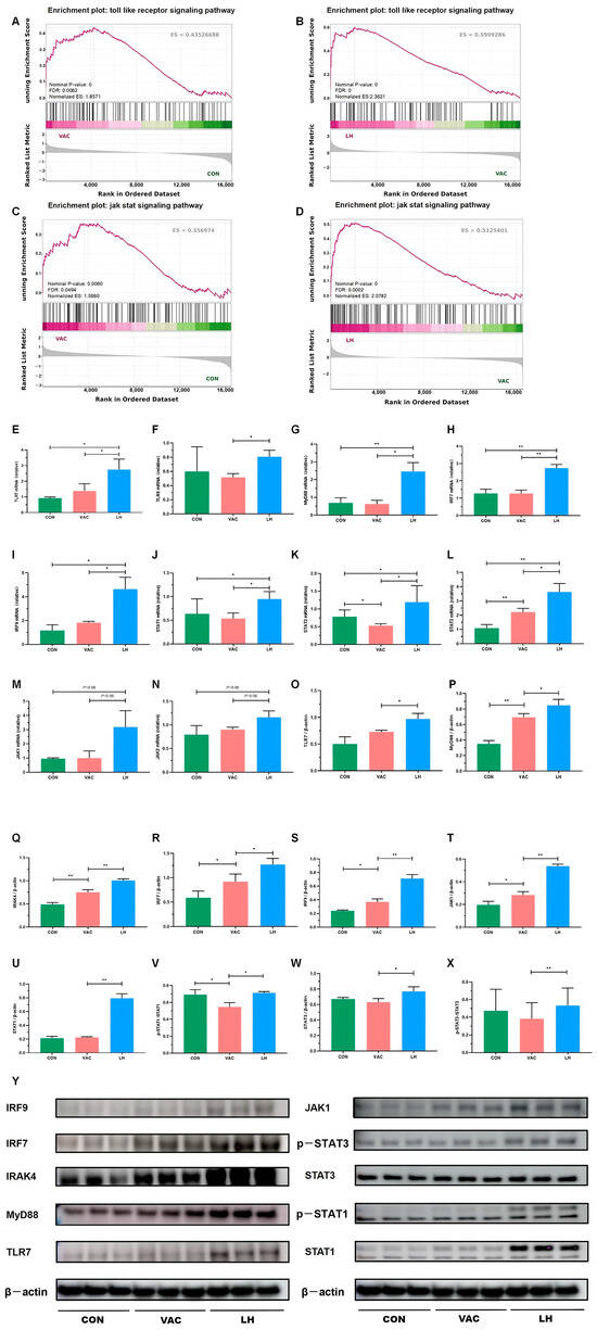 Validation of key DEGs and DEPs in the Toll-JAK-STAT signaling pathway. (A–D) GSEA analysis of the Toll-like receptor and JAK-STAT signaling pathways in the VAC vs. CON and LH vs. VAC groups. (E–N) RT-qPCR analysis showing mRNA expression levels of TLR7, TLR8, MyD88, IRF7, IRF9, STAT1, STAT2, STAT3, JAK1, and JAK2 (n = 3). (O–X) Western blot analysis of protein expression for TLR7, MyD88, IRAK4, IRF7, IRF9, JAK1, pSTAT1, STAT1, pSTAT3, and STAT3 in the CON, VAC, and LH groups (n = 3). (Y) WB analysis of TLR7, MyD88, IRAK4, IRF7, IRF9, JAK1, pSTAT1, STAT1, pSTAT3, and STAT3 expression across all groups. * p < 0.05, ** p < 0.01.