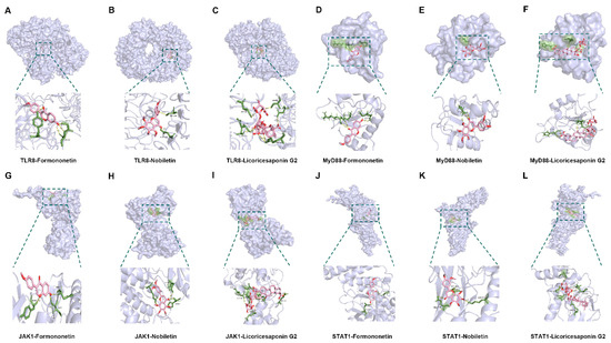 Visualization of molecular docking. (A–C) Visualization of docking results between TRL8 and Formononetin, Nobiletin, and Licoricesaponin G2. (D–F) Visualization of docking results between MyD88 and Formononetin, Nobiletin, and Licoricesaponin G2. (G–I) Visualization of docking results between JAK1 and Formononetin, Nobiletin, and Licoricesaponin G2. (J–L) Visualization of docking results between STAT1 and Formononetin, Nobiletin, and Licoricesaponin G2.