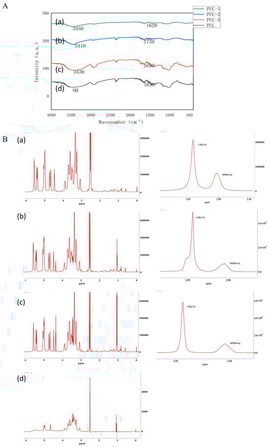 (A). PUC polymer synthesis using infrared spectrophotometry, (a) pullulan, (b) 0.13 PUC polymer, (c) 0.15 PUC polymer, (d) 0.18 PUC polymer. (B). NMR detection of PUC polymer synthesis, (a) 0.13 PUC polymer, (b) 0.15 PUC polymer, (c) 0.18 PUC polymer, (d) pullulan.
