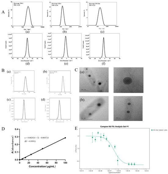 (A). Characterization of PUC nanoparticles at different feeding ratios by DLS; (a,b) shows the particle size and zeta potential of 0.13-scale nanoparticles; (c,d) shows the particle size and zeta potential of 0.15-scale nanoparticles; (e,f) shows the particle size and zeta potential of 0.18-scale nanoparticles. (B). (a,b) shows the particle size and potential values of adsorbed Tween-80-PUC nanoparticles; (c,d) are the particle size and potential values of BD-PUC. (C) Transmission electron microscopy observation of the morphology (a) for PUC nanoparticles; (b) for BD-PUC nanoparticles. (D). The standard curve for BD is y = 0.002924 × X − 0.004724 (R2 = 0.9991). (E). MST detection of Tween-80 and FITC-PUC nanoparticles by MST assay to verify the binding ability of both.