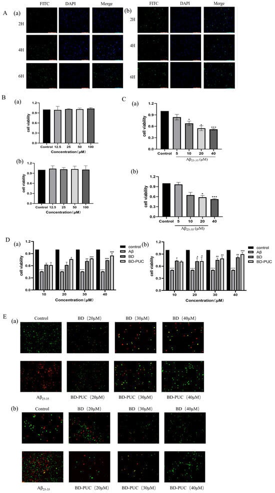 (A). After staining with DAPI and FITC-PUC nanoparticles: (a) inverted fluorescence images of SH-SY5Y cells, SH-SY5Y cells were able to take up PUC nanoparticles; (b) inverted fluorescence images of PC12 cells showed green fluorescence in PC12 cells, PC12 cells were able to take up PUC nanoparticles. (Scale length: 200 µm) (B). After treating cells with different concentrations of blank PUC nanoparticles: (a) PUC nanoparticles were not toxic to SH-SY5Y cells, (b) PUC nanoparticles were not toxic to PC12 cells. (C). After treatment of cells with different concentrations of Aβ25-35: (a) the effect of Aβ25-35 on the survival rate of SH-SY5Y cells, (b) the effect of Aβ25-35 on the survival rate of PC12 cells (*** p < 0.001 vs. control group; * p < 0.05 vs. control group). (D). Pretreatment of cells with different concentrations of BD-, BD-PUC-, Aβ25-35-simulated cell injury: (a) effect of BD-PUC on the activity of Aβ25-35-injured SH-SY5Y cells, (b) effect of BD-PUC on the activity of Aβ25-35-injured PC12 cell activity (*** p < 0.001 vs. control group; # p < 0.05 vs. Aβ25-35 group; ## p < 0.01 vs. Aβ25-35 group; ### p < 0.001 vs. Aβ25-35 group). (E). Pretreatment of cells with different concentrations of BD, BD-PUC, Aβ25-35 mock cell injury: (a) BD-PUC on apoptosis of Aβ25-35-injured SH-SY5Y cells, (b) BD-PUC on apoptosis of Aβ25-35-injured PC12 cells (green fluorescence: living cells; yellow fluorescence: early apoptosis; red fluorescence: late-stage apoptosis).