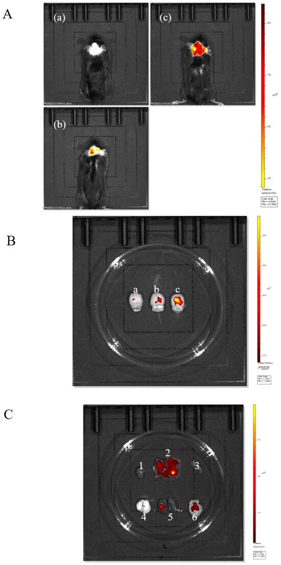 (A). In vivo imaging system assay: (a) mouse injected with free FITC; (b) mouse injected with FITC-BD-PUC nanoparticles; (c) mouse injected with Tween-80-modified FITC-BD-PUC nanoparticles. (B). In vivo imaging: (a) brain of mouse injected with free FITC; (b) brain of mouse injected with FITC-BD-PUC nanoparticles; (c) brain of mouse injected with Tween-80-modified FITC-BD-PUC nanoparticle mice. (C). Imaging of organs in mice injected with Tween-80-modified FITC-BD-PUC nanoparticles (1, 2, 3, 4, 5, 6 in the figure are heart, liver, spleen, lung, kidney, and brain, respectively).