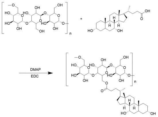 Pullulan is a natural macromolecular, straight-chain polysaccharide that is soluble in water, safe, and non-toxic, with advantageous plasticity and film-forming properties [19]. There are many hydroxyl groups on its molecular chain, and the groups of some hydrophobic substances can be attached to the polysaccharide backbone by esterification or carboxymethylation reactions with these hydroxyl groups to form amphiphilic polymers; it finds wide-ranging applications in the pharmaceutical, food, cosmetic, and agrochemical industries [20,21]. CDCA is a hydrophobic compound derived from animal gallbladders and is characterized by high biocompatibility and low toxicity [22]. The carboxyl group in this structure can combine with the hydroxyl group in pullulan to form an amphiphilic polymer.