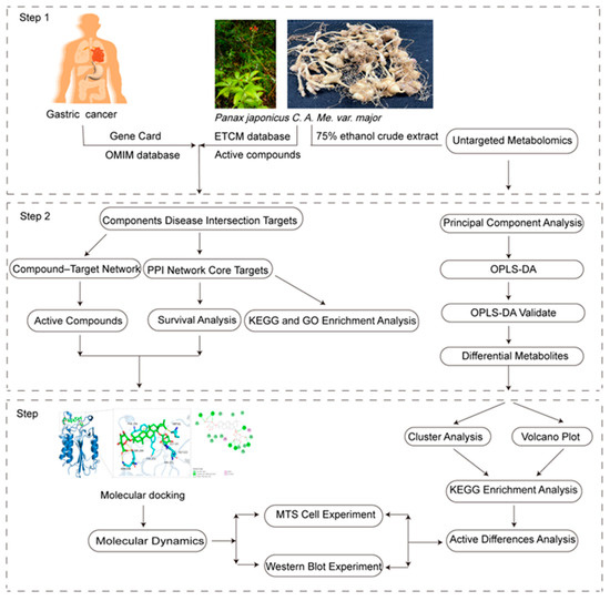 Chicago/Turabian StyleHuang, Chao, Ge Li, Xiuxiang Yan, Terd Disayathanoowat, Angkhana Inta, Lu Gao, and Lixin Yang. 2025. "Molecular Mechanisms of Panax japonicus var. major Against Gastric Cancer: Metabolite Analysis, Signaling Pathways, and Protein Targets" Pharmaceuticals 18, no. 6: 823. https://doi.org/10.3390/ph18060823