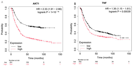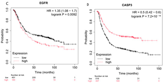 2.4. Effect of the Expression of CASP3, AKT1, TNF, and EGFR on Patient Survival