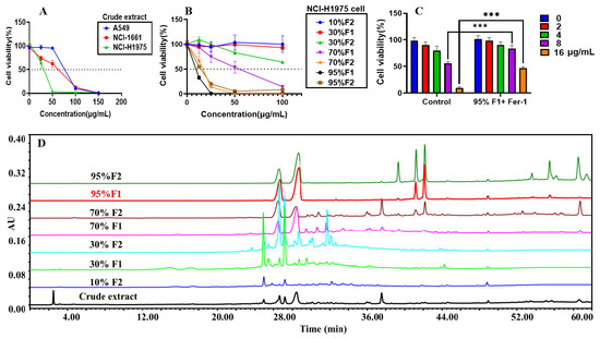 Cytotoxic effects of crude extract and polarity-based fractions of C. nitidissima on lung cancer H1975 cells and corresponding HPLC chromatograms. (A) Inhibitory effects of the C. nitidissima crude extract on the viability of the A549, NCI-H1661, and NCI-H1975 lung cancer cell lines. (B) Effects of different polarity fractions of C. nitidissima on the viability of NCI-H1975 cells. (C) Verification of ferroptosis involvement by assessing the cytotoxicity of the 95% F1 fraction in the presence of the ferroptosis inhibitor Fer-1. Results are expressed as the mean ± SEM (n = 4). ***: p < 0.0001 compared with the control group (treatment with 95% F1 alone). (D) HPLC fingerprint chromatograms of the crude extract and various polarity fractions of C. nitidissima.