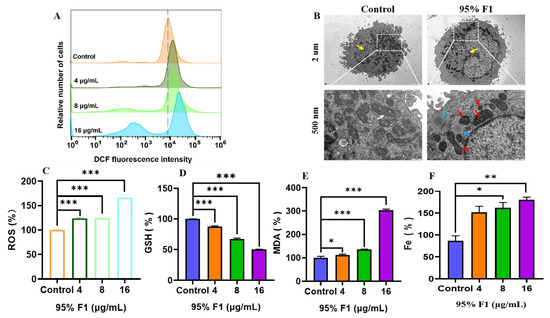 Flow cytometry analysis revealed that 95% F1 significantly increased intracellular ROS levels in a dose-dependent manner (Figure 3A,C). Compared to the control, DCF fluorescence intensity was markedly elevated at 4.0 μg/mL and further intensified at 8.0 and 16 μg/mL, indicating substantial ROS accumulation. Excessive ROS generation may disrupt redox homeostasis, leading to oxidative stress, mitochondrial damage, lipid peroxidation, and ultimately ferroptosis.