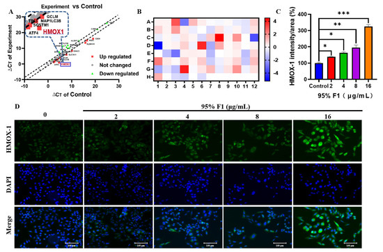 The 95% F1 fraction of C. nitidissima upregulates the expression of HMOX-1 to induce ferroptosis in NCI-H1975 lung cancer cells. (A) Differential gene expression analysis using the PCR Array, highlighting key genes associated with ferroptosis. (B) Heatmap of gene expression changes under different treatment conditions, demonstrating the expression profile of ferroptosis-related genes. (C) Effects of different treatments of 95% F1 (2, 4, 8, and 16 μg/mL) on HMOX-1 expression levels. The bar graph shows the HMOX-1 intensity/area (%) in different treatment groups compared to the control group. (D) Immunofluorescence images showing HMOX-1 expression levels in H1975 cells treated with increasing concentrations of the 95% F1 fraction (0, 2, 4, 8, and 16 μg/mL). Results are expressed as the mean ± SEM (n = 3). *: p < 0.05, **: p < 0.01, and ***: p < 0.0001 compared with control group.