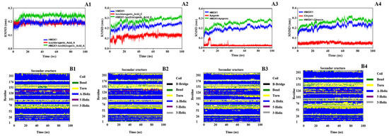 RMSD and secondary structure analysis of HMOX-1 in complex with active compounds from the 95% F1 fraction of C. nitidissima based on MD simulations. (A1–A4) RMSD plots of HMOX-1 complexes with (1) isochlorogenic acid A, (2) isochlorogenic acid C, (3) apigenin, and (4) chrysin, respectively. (B1–B4) Secondary structure evolution of HMOX-1 during the simulation in the presence of the same compounds, respectively.