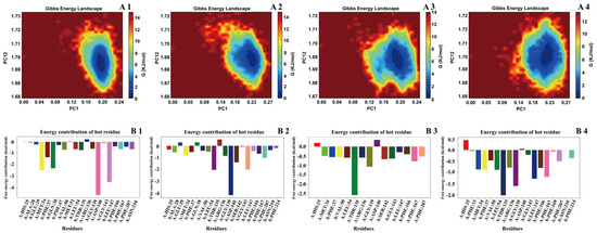 Gibbs free energy landscape and energy contribution of key residues in HMOX-1 binding with active compounds from the 95% F1 fraction of C. nitidissima based on MD simulations. (A1–A4) Gibbs free energy landscapes of HMOX-1 complexes with (1) isochlorogenic acid A, (2) isochlorogenic acid C, (3) apigenin, and (4) chrysin, respectively. (B1–B4) Per-residue energy contribution analysis identifying key “hot spot” residues involved in the binding of the same four compounds to HMOX-1.