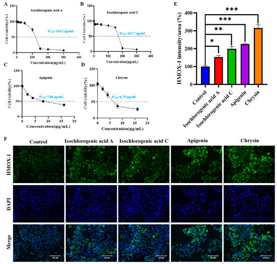 Evaluation of the cytotoxic effects and HMOX-1 expression in NCI-H1975 lung cancer cells treated with major active compounds from C. nitidissima. (A–D) Effect of isochlorogenic acid A, isochlorogenic acid C, apigenin, and chrysin on the viability of NCI-H1975 Cells. (E) Effects of different treatments on HMOX-1 expression levels. The bar graph shows the HMOX-1 intensity/area (%) in different treatment groups compared to the control group. (F) Immunofluorescence images showing HMOX-1 expression in NCI-H1975 cells following treatment with isochlorogenic acid A, isochlorogenic acid C, apigenin, and chrysin. Results are expressed as the mean ± SEM (n = 3). *: p < 0.05, **: p < 0.01, and ***: p < 0.0001 compared with the control group.