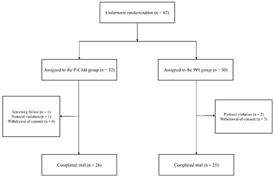 All enrolled KTRs (n = 62) were randomly assigned to either the P-CAB group (n = 32) or the PPI group (n = 30). Following the exclusion of participants who did not adhere to the study protocol or withdrew their consent, 51 KTRs completed the study, with 26 in the P-CAB group and 25 in the PPI group (Figure 1).