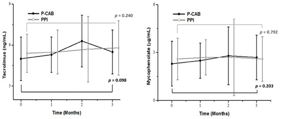 However, few studies have evaluated the drug interaction between P-CABs and immunosuppressants in KTRs. Two retrospective studies reported that switching from rabeprazole to vonoprazan increased the tacrolimus concentration in KTRs [27,28]. Conversely, Watari et al. demonstrated that conversion from rabeprazole to vonoprazan did not alter the tacrolimus trough levels regardless of CYP3A5 genotypes [29]. Our study distinguished itself by directly analyzing the impact of P-CABs compared to PPIs in a randomized controlled trial. This study is significant as it provides evidence that P-CAB use in KTRs did not significantly impact the blood concentrations of immunosuppressants over the study period. To our knowledge, no existing research has directly investigated the potential relationship between P-CAB intake and intrapatient variability in KTRs.