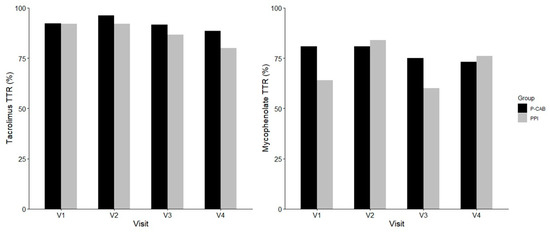 Comparison of time in therapeutic range (TTR) for tacrolimus and mycophenolate between P-CAB (black) and PPI (gray) groups across visits. TTR values were calculated at each scheduled visit. Abbreviations: PPI, proton pump inhibitor; P-CAB, potassium-competitive acid blocker; TTR, time in therapeutic range.