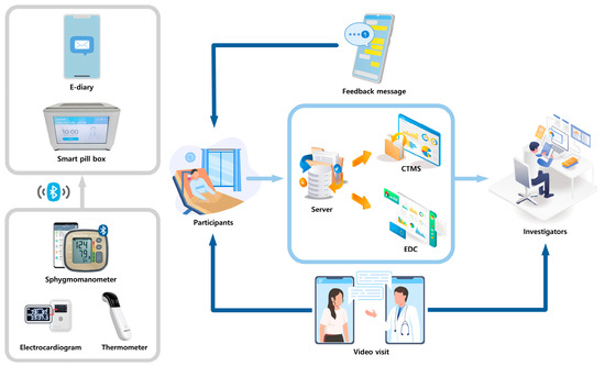 Schematic representation of the smart clinical trial system. The smart clinical trial platform integrates a smart pill box, remote home monitoring, an electronic case report form, a comprehensive clinical trial management system, an electronic diary application, non-face-to-face video consultations, and safety management systems.
