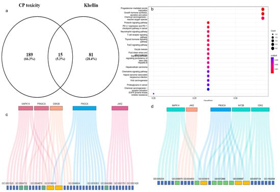 Network pharmacology analysis of the potential mechanism of Khe as a renoprotective agent and the relationship between Khe targets and CDDP-induced nephrotoxicity through multiple studies. (a) A Venn diagram highlights the overlap between CDDP toxicity-associated targets, and Khe shows 15 shared targets. (b) KEGG pathway enrichment analysis of the shared targets identifies significantly enriched pathways. (c) Gene Ontology (GO) analysis for molecular function (MF) links key genes. (d) GO analysis for cellular components (CCs).