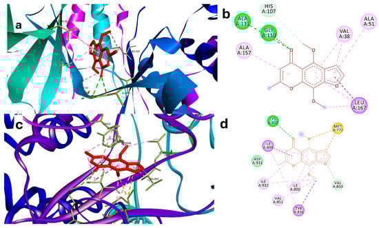 To provide molecular insights, docking studies were performed with Khe and two of the most significant targets revealed by network pharmacology analysis, i.e., PI3K and MAPK14. The 3D crystal structures of PI3K (PDB ID: 3HHM) and MAPK14 (PDB ID: 2QD9) were retrieved from the Protein Data Bank (PDB, https://www.rcsb.org/ (accessed on 15 February 2025)). The protein structures were prepared for docking by removing water molecules, adding polar hydrogens, and optimizing protonation states using Discovery Studio Visualizer 2020. The Khe structure was prepared via energy minimization to optimize its conformation. Docking simulations were carried out using LeadIT 2.1 (BioSolveIT), employing the FlexX algorithm for accurate ligand–target binding predictions [59]. The software validation was confirmed through the redocking of the co-crystallized ligands to ensure the RMSD between experimental and docked pose was less than 2 Å. Multiple binding poses were generated and ranked for each protein–ligand complex based on binding energy and fit scores and inspected manually to select the pose achieving significant binding to amino acid residue involved in catalytic activity of the enzyme. The interactions within the ligand–protein complexes were visualized using Discovery Studio Visualizer 2020 to generate 3D and 2D interaction diagrams [60].
