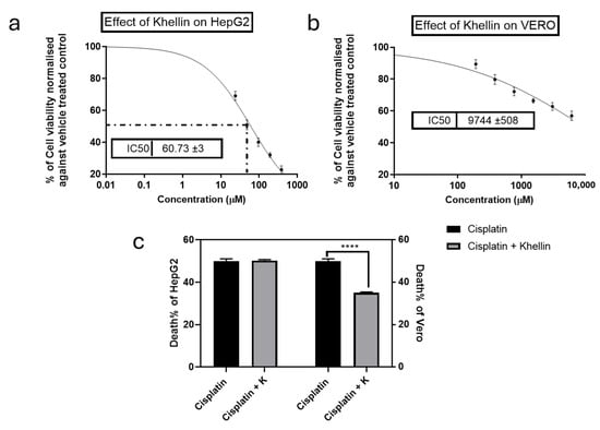 CDDP is well-known for its significant cytotoxicity on normal cells due to its low selectivity index. To evaluate whether Khe can mitigate this toxicity without compromising CDDP anticancer effects, an MTT assay was performed to determine the IC50 values of CDDP and/or Khe on liver cancer HepG2 and normal kidney Vero cells. CDDP exhibited IC50 values of 24.2 µM and 25.9 µM on HepG2 and Vero cells, respectively. In contrast, Khe displayed higher IC50 values of 60 µM and 9744 µg/mL on HepG2 and Vero cells, respectively (Figure 3a,b).