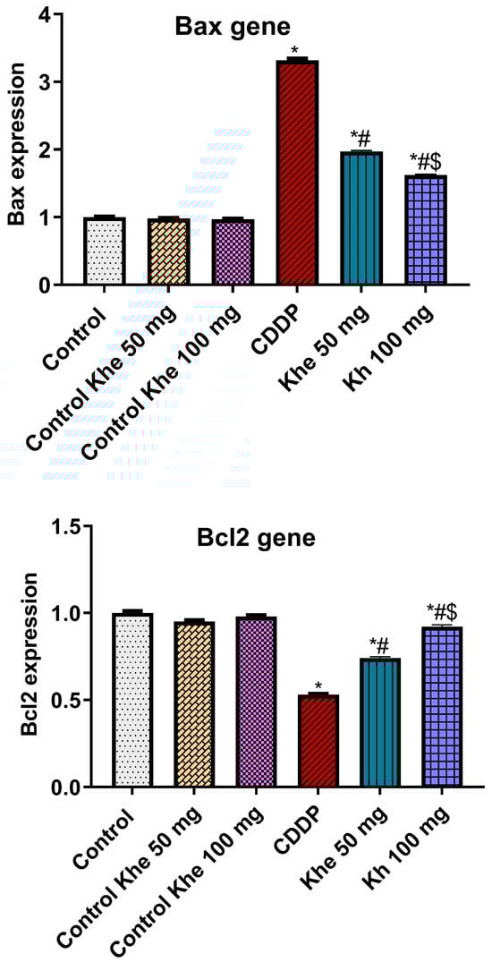 The CDDP group exhibited a significant (p < 0.05) downexpression in the renal expression of the anti-apoptotic marker (Bcl2) and a marked overexpression in the apoptotic marker (Bax) compared to the control groups (Figure 7). On the other hand, the treatment with Khe (50 or 100 mg/kg) showed a significant (p < 0.05) decline in Bax and a significant (p < 0.05) elevation in Bcl2, with a better effect for 100 mg/kg Khe, compared to the CDDP.