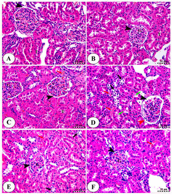 The renal cortex of the three control groups (Figure 8A–C) showed intact renal corpuscle with intact renal glomeruli (G) and narrow capsular space (arrowhead), in addition to intact renal tubular epithelium (T). There was mild congestion of renal blood vessels (red arrow) in the control + Khe 100 group (Figure 8C). The CDDP group (Figure 8D) exhibited renal glomeruli with enlarged capsular space (black arrowhead), irregularities of Bowmann’s capsule (red arrowhead), vacuolar degeneration of renal tubules (black arrows), and accumulation of acidophilic proteinaceous substance inside the lumen of some tubules (green arrows), in addition to congestion of renal blood vessels (red arrows). The Khe 50 (Figure 8E) and Khe 100 (Figure 8F) groups displayed intact renal corpuscles with normal glomeruli surrounded by narrow capsular space (black arrowhead), mild congestion of renal blood vessels (red arrows), and mild vacuolar degeneration of some renal tubules (black arrows) in the Khe 50 group. The damage-score data indicated that the CDDP group sustained much more damage than the three control groups. However, the Khe-treated animals showed much less damage than the CDDP group (Table 4).