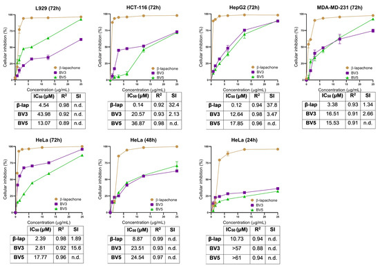 Cellular inhibition percentage of compounds BV3 and BV5 in the normal L929 cell line and the tumor cell lines HCT-116, HepG2, MDA-MD-231, and HeLa obtained through the MTT test. β-lap was used as a positive control. The data are presented as a mean and standard deviation. Below each graph, the IC50 (µM) of the compounds, R-squared (R2), and selectivity index (SI) are depicted accordingly. Not determined or <1 (n.d.). The experiment was performed in triplicate in two independent experiments (n = 6).