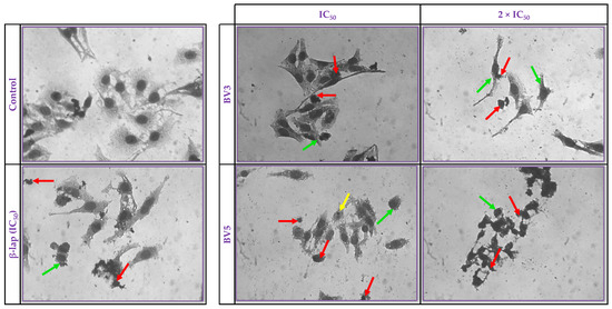 Morphological analysis of HeLa cells after 72 h of treatment with BV3 and BV5 at IC50 and 2 × IC50 concentrations were conducted using rapid panoptic staining and visualization through optical microscopy. The control group (Control) cells were treated with the vehicle (DMSO 0.1%). β-lap served as a standard at 2.4 µM. Staining with rapid panoptic allowed visualization under an optical microscope at a 400× magnification. Arrows indicate observed features: cellular volume reduction (green arrow), debris (red arrow), and pyknotic nucleus (yellow arrow). The experiment was performed in triplicate in two independent experiments (n = 6).