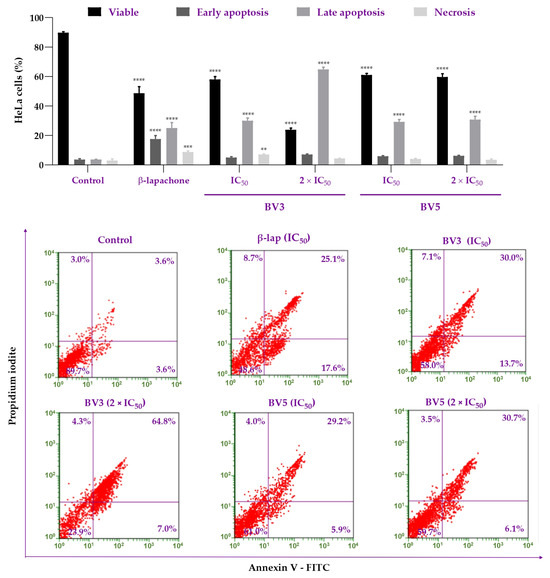 Effects of BV3 and BV5 compounds on HeLa cells after 48 h of incubation with the compounds. Cells were incubated with concentrations corresponding to the IC50 and 2 × IC50 of BV3 (23.5 and 47.0 µM), and BV5 (24.54 and 49.08 µM) obtained at the 48 h time point. β-lap was used as a positive control (8.87 µM) labeled with Annexin V-FITC and propidium iodide. Data are expressed as mean ± SEM. Statistical significance was determined by comparing the treatment to the negative control using ANOVA followed by Dunnett’s test, with p < 0.05 considered significant. (****) p < 0.0001 (***) p = 0.0001 (**) p = 0.0019. The experiment was performed in triplicate in two independent experiments (n = 6).