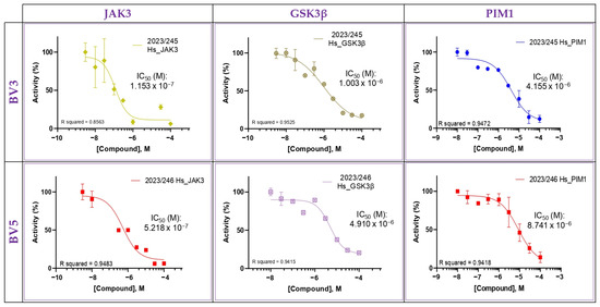 Furthermore, the IC50 for the most sensitive targets were determined. Thus, the IC50 values obtained for JAK3 were 0.11 µM and 0.52 µM; for GSK3β 1.00 µM and 4.91 µM; and for PIM1 4.15 µM and 8.74 µM for BV3 and BV5, respectively (Figure 5).
