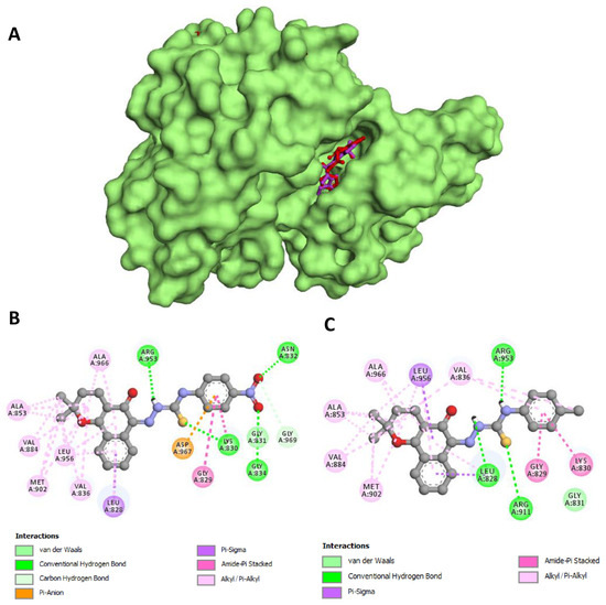 Similar behavior was observed for compound BV5 (Figure 6C), in which the interactions of the naphthoquinone moiety were formed with the same amino acids that interacted with this moiety of compound BV3. The exchange of the nitro group made the side chain more hydrophobic, providing Van der Waals interactions with Gly831, in addition to the amide–pi stacked interactions with Gly829 and Lys830. Hydrogen bonds were again observed for the thiosemicarbazone moiety, formed with Leu828, Arg911, and Arg953.